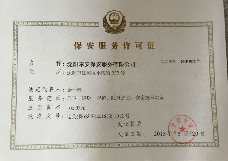 沈陽奉安保安服務(wù)有限公司(原沈陽市沈河區(qū)保安服務(wù)公司)創(chuàng)建于一九八八年八月,是遼寧省公安廳、沈陽市公安局批準(zhǔn),工商行政部門登記注冊,全市首家具備保安資質(zhì)的特殊性服務(wù)企業(yè),隸屬于沈陽市沈河區(qū)政府直管的全民國有企業(yè),現(xiàn)為中國保安協(xié)會會員單位和省保協(xié)、市保協(xié)常務(wù)理事單位:在全市同行業(yè)中率先通過ISO國際質(zhì)量認(rèn)證,是市工商局批準(zhǔn)的“重合同守信用”免檢單位和沈陽市政府采購中心保安服務(wù)項目重點競標(biāo)單位;擁有一支專業(yè)化、標(biāo)準(zhǔn)化、職業(yè)化的高素質(zhì)保安隊伍,是公安機關(guān)重要的輔警力量。
